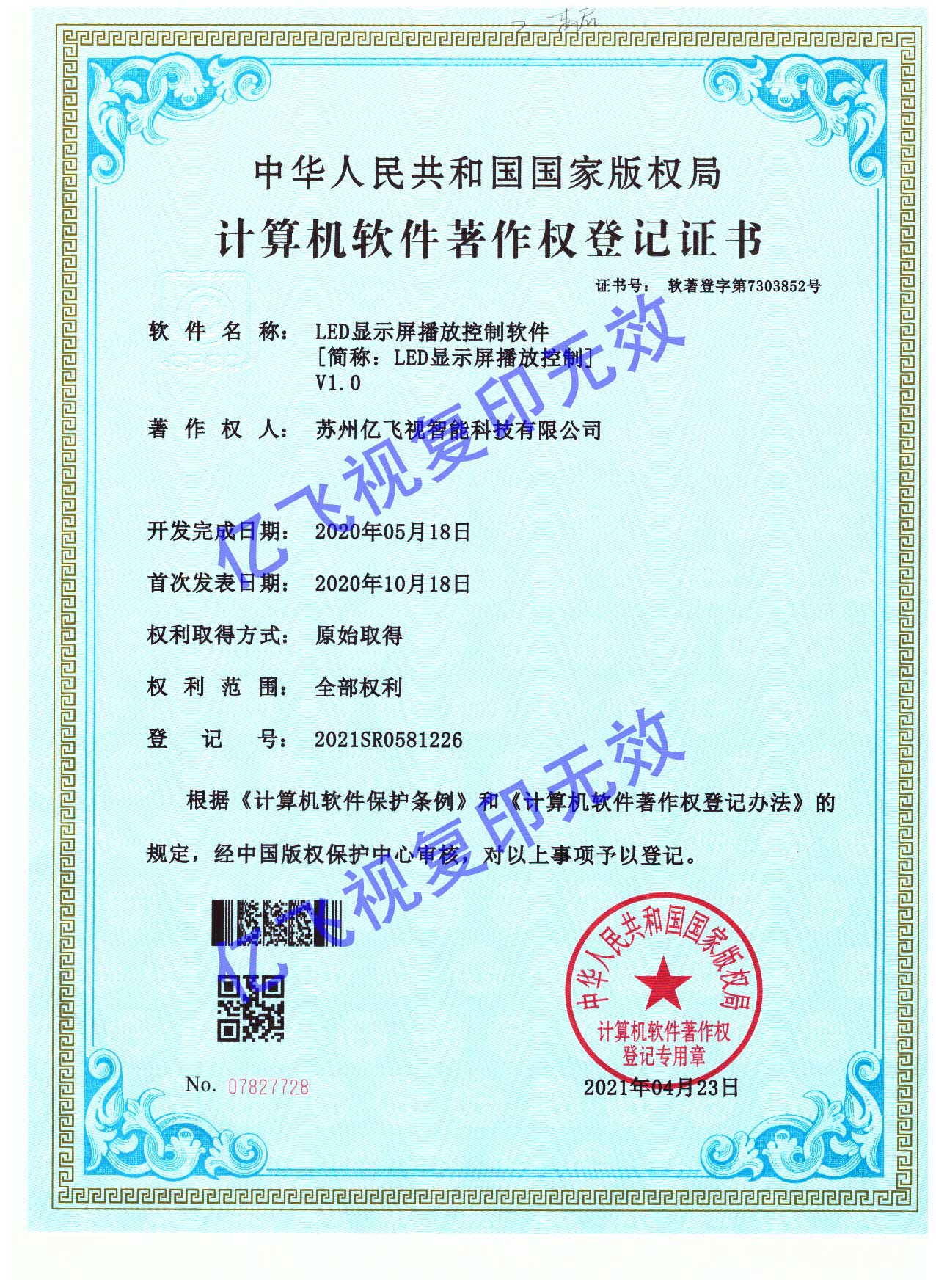 亿飞视LED显示屏播放控制软件获得国家版权局软件著作权,欢迎各单位选用我司产品参与投标。